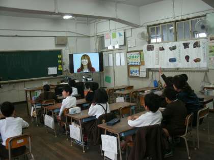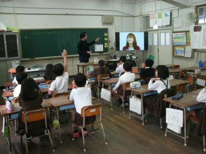 2年2組は、笑顔の女性の映像を見ながら、話し合っていました。