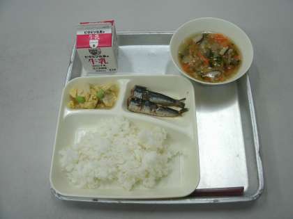 今日の給食は、いわしのしょうが煮、うすくず汁、高野豆腐の卵とじ、ごはん、牛乳です。