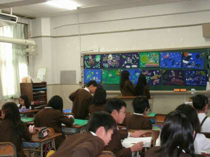 「自転車に乗って夢の世界に行こう」が仕上がり、みんなの作品の鑑賞をしていました。