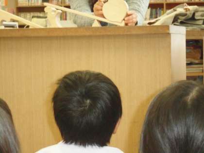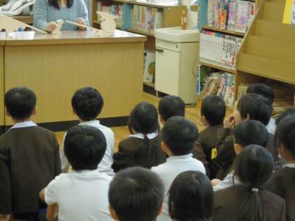 木曜日は図書館補助員の方に来ていただいています。図書室で「大きなかぶ」の読み聞かせをしていただきました。今日は絵本を見せながらの読み聞かせではなく、それぞれの場面の様子を積木を動かしながら表現しながらの読み聞かせでした。丸い積木をかぶに見立てています。