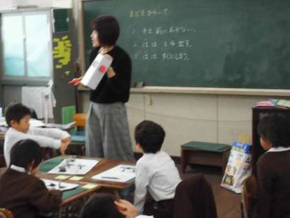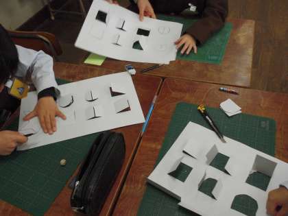 図工で、たてものの窓を開けて中にお気に入りのものを書いて表現する学習をしています。カッターを使って窓を開けるのですが、活動に入る前に先生から安全な切り方を教えてもらいました。安全に気をつけて、すばらしい作品をつくってほしいと思います。
