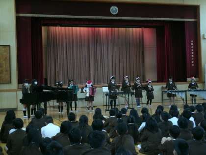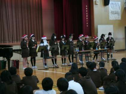 ハンドベルによるクリスマスソングの演奏は、静かな講堂に美しく響きました。