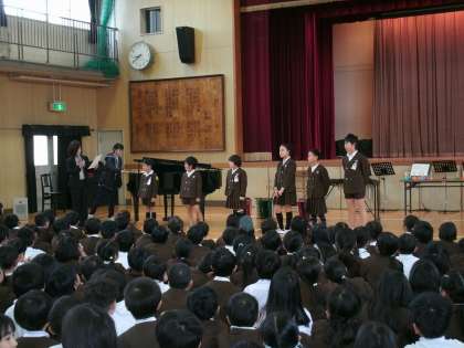 今朝の児童朝会は、音楽・合唱クラブの発表でした。