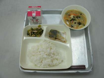 今日の給食は、さばのみぞれかけ、みそ汁、小松菜の煮びたし、ごはん、牛乳です。
