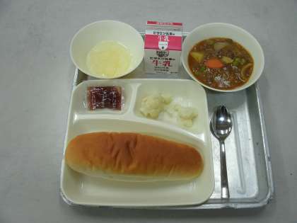 今日の給食は、ビーフシチュー、カリフラワーのピクルス、和なし(缶)、コッペパン、牛乳です。