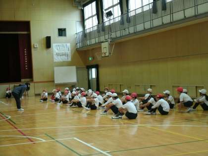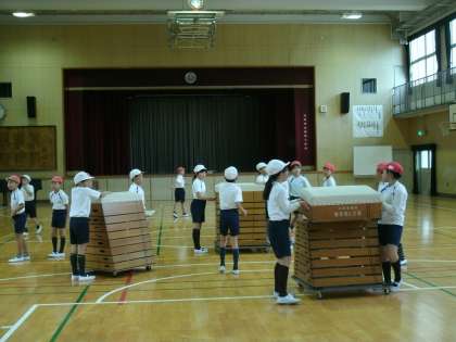 担任の先生の説明を聞いた後、みんなで協力して手際よくとび箱・マットの準備をしていました。