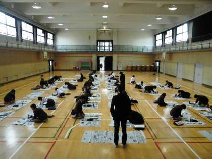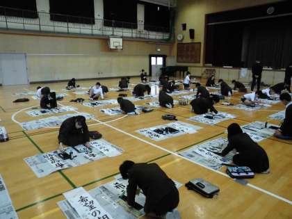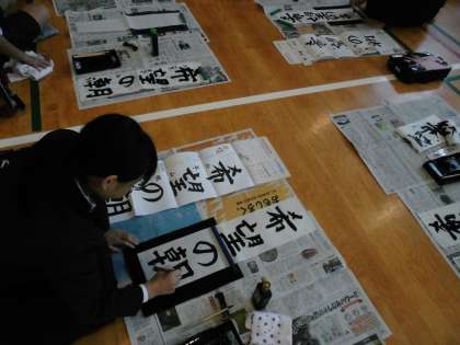 今日は書初めをしました。「希望の朝」の4字を長い書道用紙に書きました。一切私語せずとても真剣に取り組むことができました。