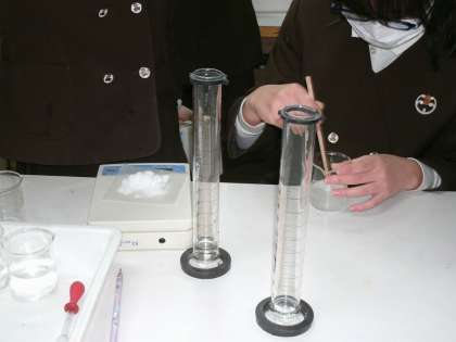 理科室で、ものが水にとける量について、食塩で実験をしていました。