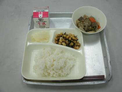今日の給食は、筑前煮、ひじき豆、だいこんのゆず風味、ごはん、牛乳です。