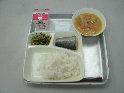 今日の給食は、さごしのしょうゆだれかけ、みそ汁、みずなの煮びたし、ごはん、牛乳です。
