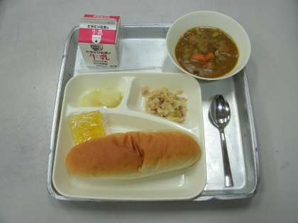 今日の給食は、ミートボールと野菜のカレー煮、ツナとキャベツのソテー、焼きじゃが、コッペパン、牛乳です。