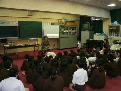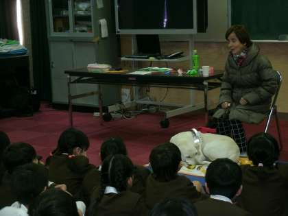 3年生は、多目的室で盲導犬と暮らしている方からお話を聞いていました。
