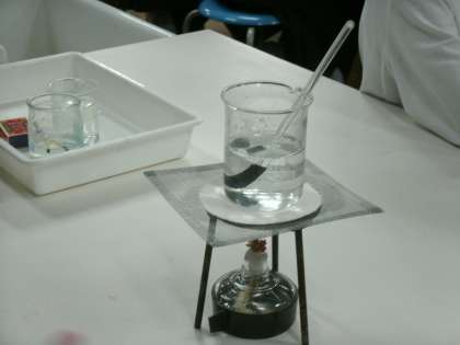 「もののとけ方」の学習で、100mlの水に食塩を溶けるだけとかし、その水溶液にミョウバンは溶けるかどうか予想をたててから、実際に溶かしていました。