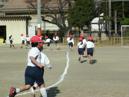 1年生は、運動場で体育をしていました。