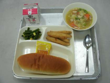 今日の給食は、わかさぎフライ、スープ煮、三度豆とコーンの甘酢あえ、コッペパン、牛乳です。