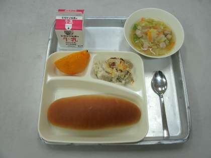 今日の給食は、押し麦のグラタン、スープ、デコポン、黒糖パン、牛乳です。