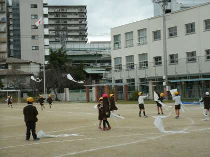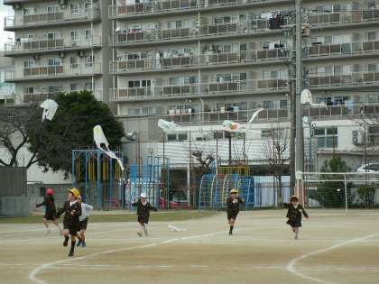 1年2組は、図画工作の学習で作った「ぐにゃぐにゃだこ」を運動場であげていました。うまくあがるでしょうか。
