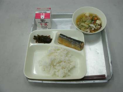 今日の給食は、さんまのみぞれかけ、すまし汁、茎わかめのつくだ煮、ごはん、牛乳です。
