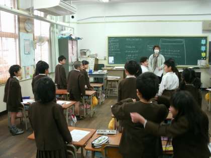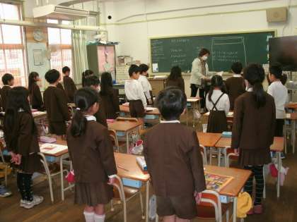 1年2組は、磯路保育所との交流会の開会式と閉会式の練習をしていました。