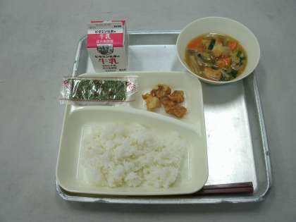 今日の給食は、あげ鶏のねぎソースかけ、あつあげとはくさいの中華煮、焼きのり、ごはん、牛乳です。