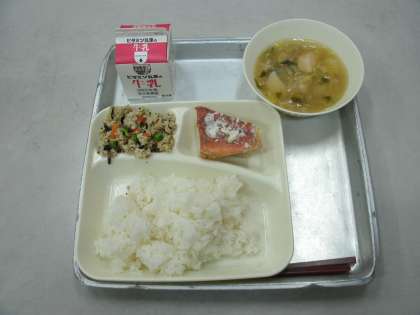 今日の給食は、赤魚のレモンじょうゆかけ、うすくず汁、高野豆腐のいり煮、ごはん、牛乳です。