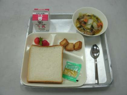 今日の給食は、豚肉と白菜のうま煮、あつあげのピり辛じょうゆあえ、いちご、食パン、牛乳です。