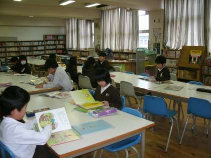 1年2組は、図書室で読書をしていました。