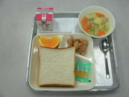 今日の給食は、鶏肉のみそバターソース、スープ煮、デコポン、食パン、牛乳です。