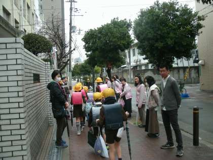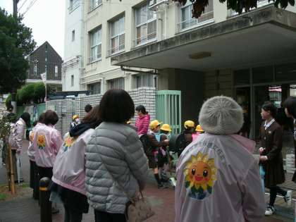 毎月第1・第3月曜日の朝は、港区更生保護女性会の皆さんによる「愛の一声運動」が行われます。ふっていた雨も子どもたちの登校時間帯にはやみ、元気な朝のあいさつが響きました。