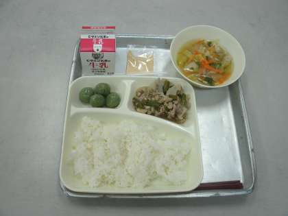 今日の給食は、豚肉とれんこんのいため煮、すまし汁、きな粉よもぎだんご、ごはん、牛乳です。