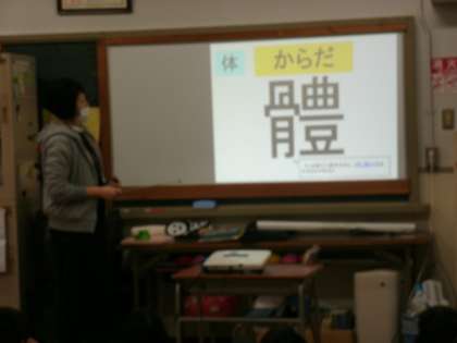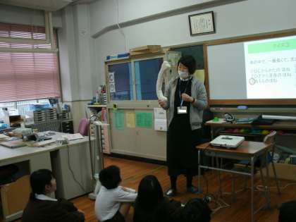体重を測定する前に4年生が保健指導を受けていました。