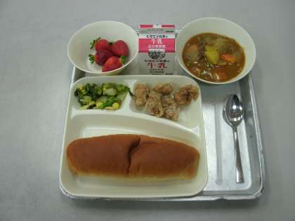 今日の給食は、フライドチキン、カレーシチュー、春のカラフルソテー、いちご、黒糖パン、牛乳です。