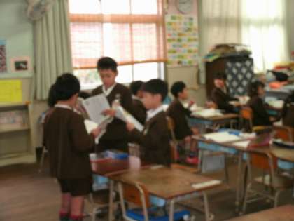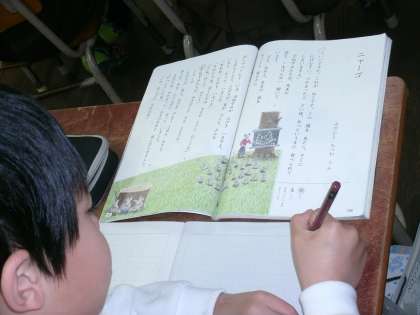 班で「ニャーゴ」の音読をした後、子ねずみとねこの様子や気持ちを考えていました。