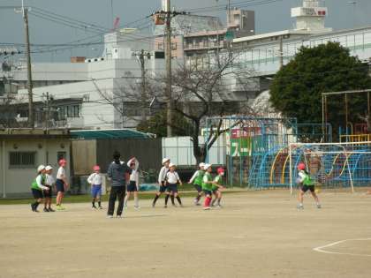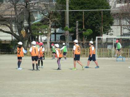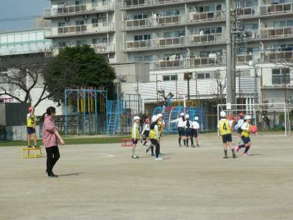 ポートボールのチームごとに分かれて練習をした後、試合を開始していました。