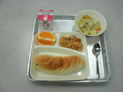今日の給食は、とうふのミートグラタン、押し麦と野菜のスープ煮、デコポン、おさつパン、牛乳です。