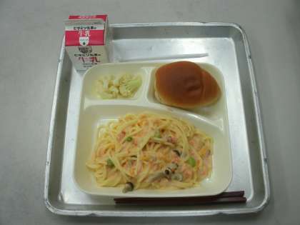 今日の給食は、さけのクリームスパゲッティ、カリフラワーのサラダ、黒糖クレセントロールパン、牛乳です。