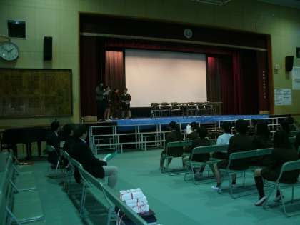 5・6時間目、6年生は、講堂で茶話会をしていました。