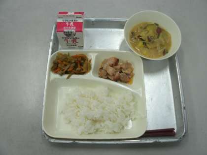 今日の給食は、鶏肉の照り焼き、さつまいものみそ汁、きんぴらごぼう、ごはん、牛乳です。