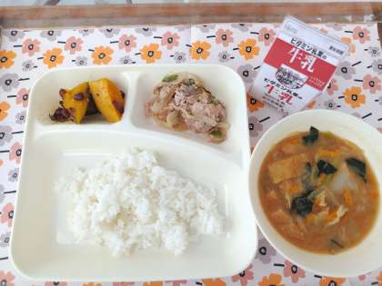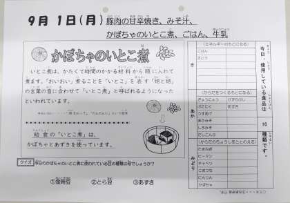 9/1今日の給食は「豚肉の甘辛焼き、みそ汁、かぼちゃのいとこ煮、ごはん、牛乳」です。