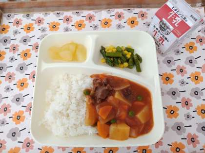 9/4今日の給食は「ハヤシライス、グリーンアスパラガスとコーンのサラダ、洋なし(カット缶)、牛乳」です。