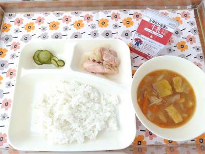 9/8今日の給食は「鶏肉の塩こうじ焼き、さつまいものみそ汁、きゅうりの甘酢あえ、ごはん、牛乳」です。