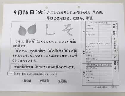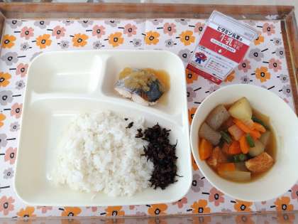 9/16今日の給食は「さごしのおろしじょうゆかけ、含め煮、牛ひじきそぼろ、ごはん、牛乳」です。