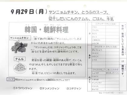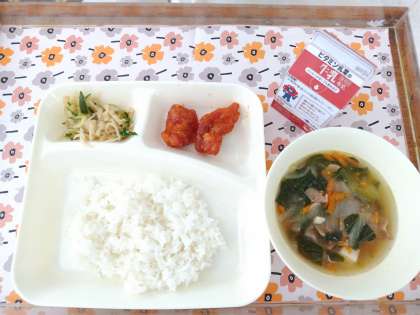 9/29今日の献立は「ヤンニョムチキン、とうふのスープ、切干しだいこんのナムル、ごはん、牛乳」です。