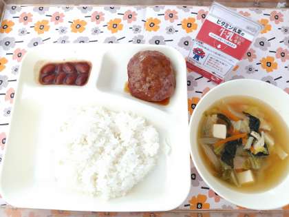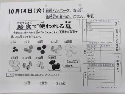 10/14今日の給食は「和風ハンバーグ、五目汁、金時豆、ごはん、牛乳」です。