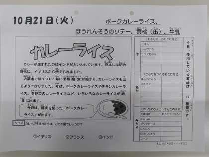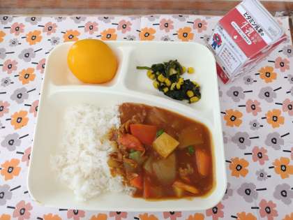 10/21今日の給食は「ポークカレーライス、ほうれんそうのソテー、黄桃(缶)、牛乳」です。