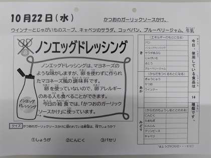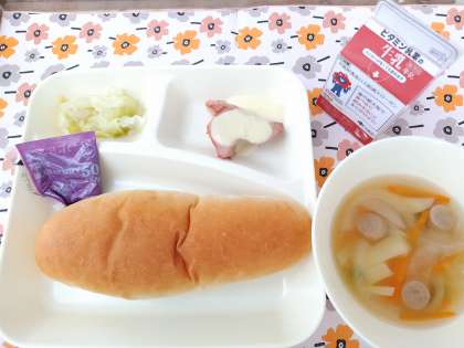 10/22今日の献立は「かつおのガーリックソースかけ、ウインナーとじゃがいものスープ、キャベツのサラダ、コッペパン、ブルーベリージャム、牛乳」です。