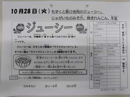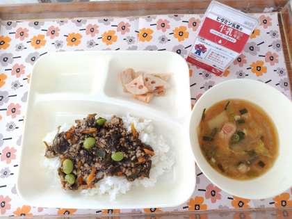 10/28今日の給食は「もずくと豚ひき肉のジューシー、じゃがいものみそ汁、焼きれんこん、牛乳」です。