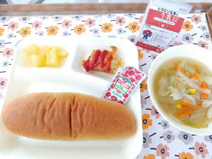 11/4今日の給食は「ツナポテトオムレツ(袋・ケチャップ)、スープ、洋なし(カット缶)、黒糖パン、牛乳です。