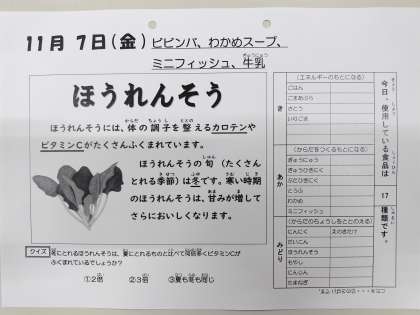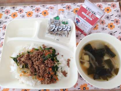 11/7今日の給食は「ビビンバ、わかめスープ、ミニフィッシュ、牛乳」です。
