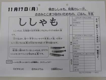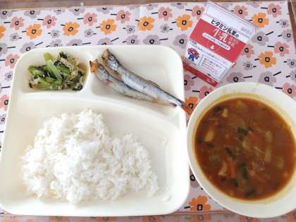 11/17今日の給食は「焼きししゃも、和風カレー汁、ささみとこまつなのいためもの、ごはん、牛乳」です。